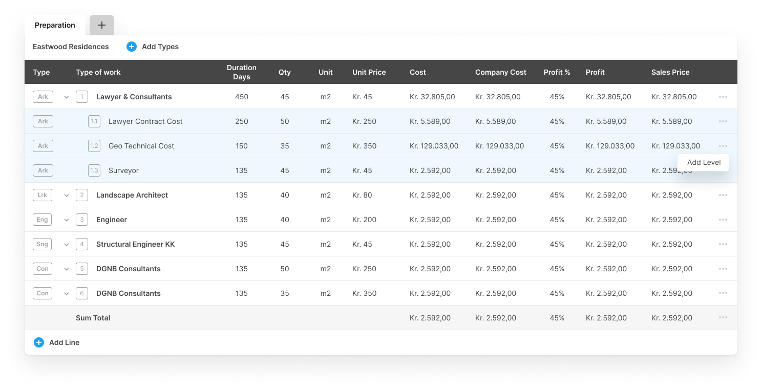 Our budget design makes it very easy to gain a complete overview of all types of projects. When using our calculation tool, you have several different calculation methods to choose between, depending on whether it’s a main contract, part-contract, or another type of calculation.